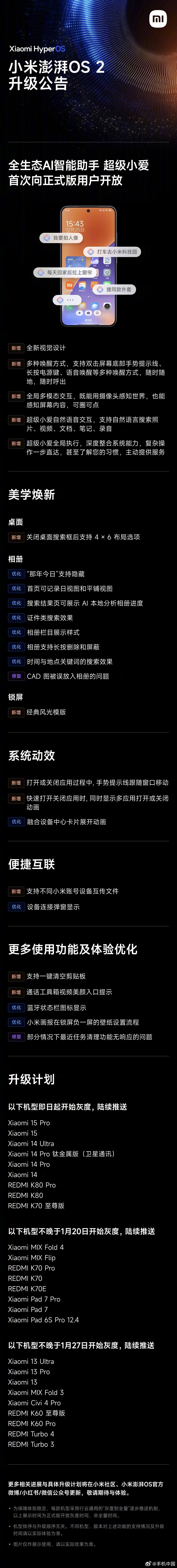 12月27日,小米澎湃OS官方宣布:#小米澎湃OS2#迎来首次OTA升级。#超级小爱#正式版首次向正式版用户开放,还有更多新增实用功能和体验优化,欢迎大家积极使用并反馈,我们也将持续迭代并逐步优化体验,感谢支持。